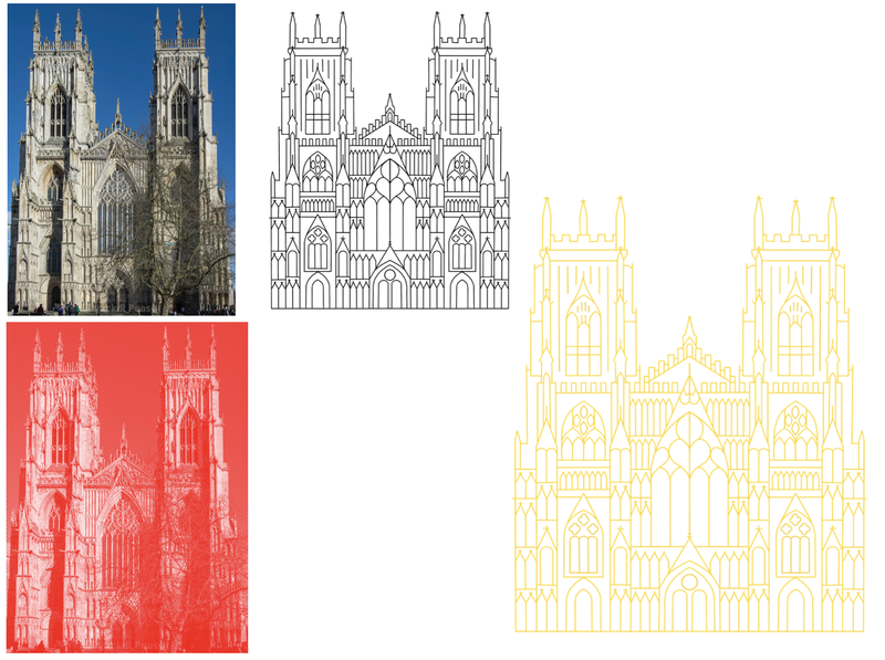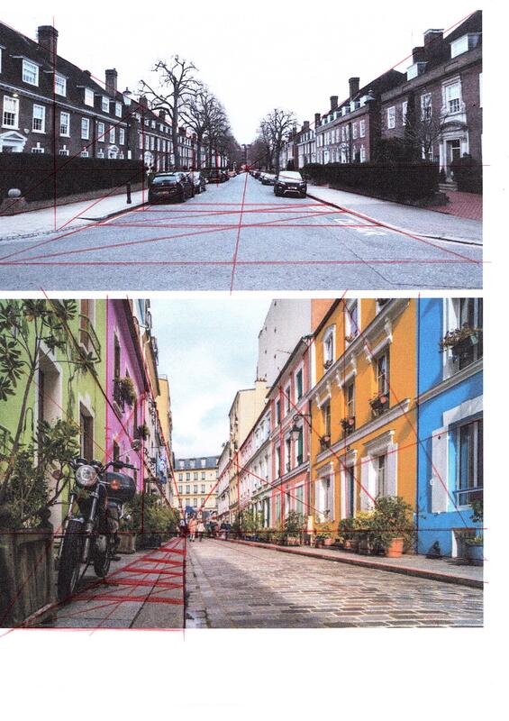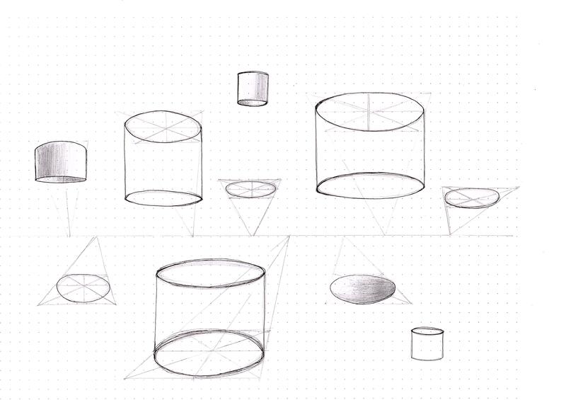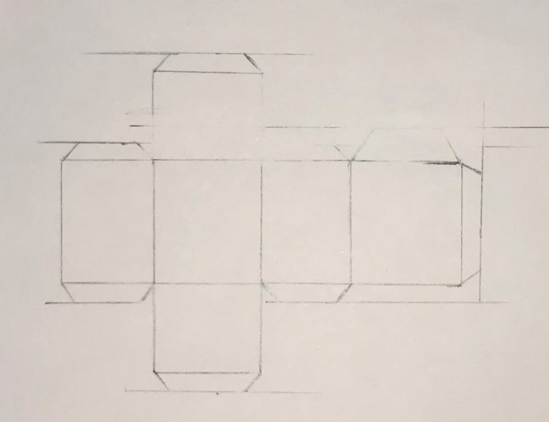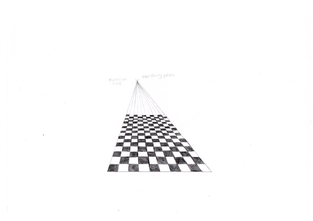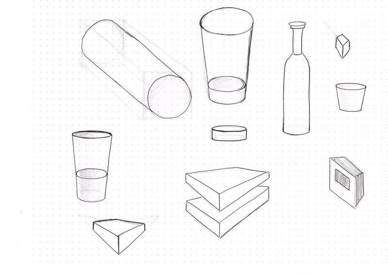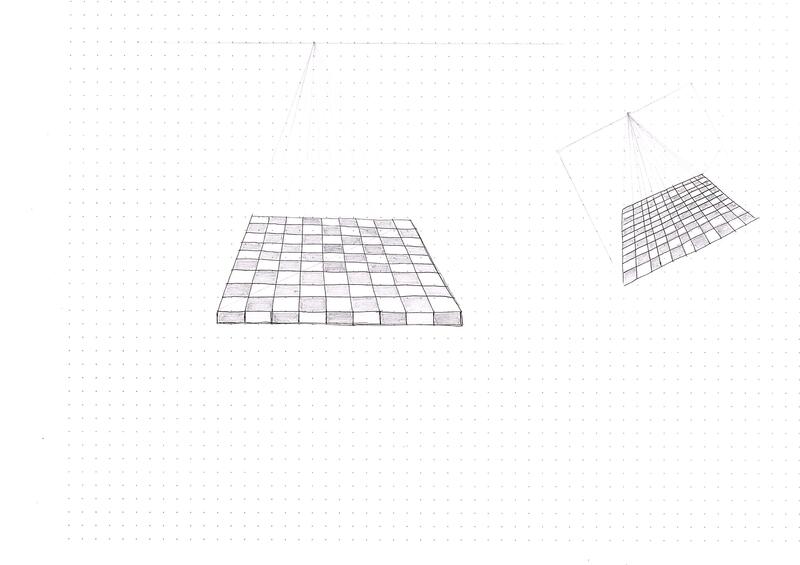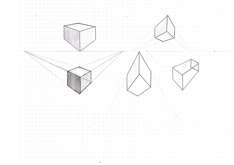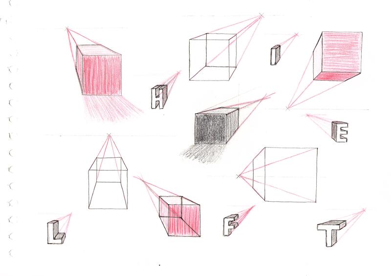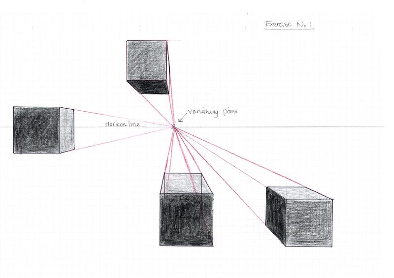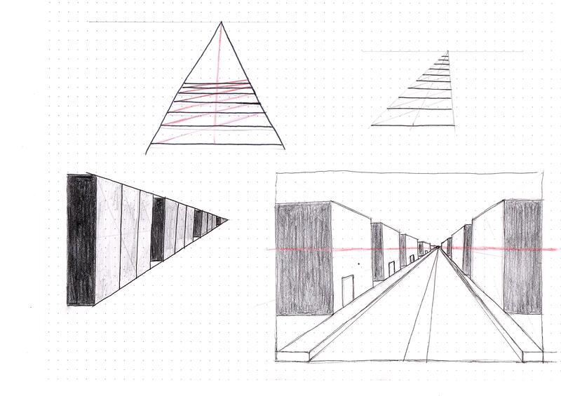 These are the designs I was most pleased with and choose to work up in more detail. The first design I chose to make more ornamental/decorative, to represent the 'royal' theme of the play, using gold and blue and further developing the idea of added a crown onto of the type itself. The second design also played with the idea of using the crown onto of the text but in a different style. This design also incorporated the skull to represent the theme of death and the character, Yoricks, skull itself. I preferred the cleanness of this poster in contrast to the third design which features a sword dripping with blood. I liked the idea of incorporating the crown into the type as the letter 'M' and also making the layout a bit more dynamic by having the text on a slant rather than it all being uniformly straight and centred. Overall, I'm happy with the outcome of the project as I think my designs are all quite different from each other, allowing the client to have a good variation of ideas to choose from. It was a big challenge trying to come up with so many ideas as its something I'm not used to doing but I will continue to improve on this as the course progresses. These two weeks revolved around developing confidence in drawing and sketching. One Point Perspective Perspective drawings make an object appear solid using a linear illusion of depth, making objects look solid and three-dimensional. One point perspective uses a single vanishing point... Moving cubes and boxes around the horizon within the frame: Playing around with fences: Playing around with grids/chessboards: Playing around with ellipses/cylinders: Two/Three Point Perspective Thumbnail Visuals Warm Up Session
