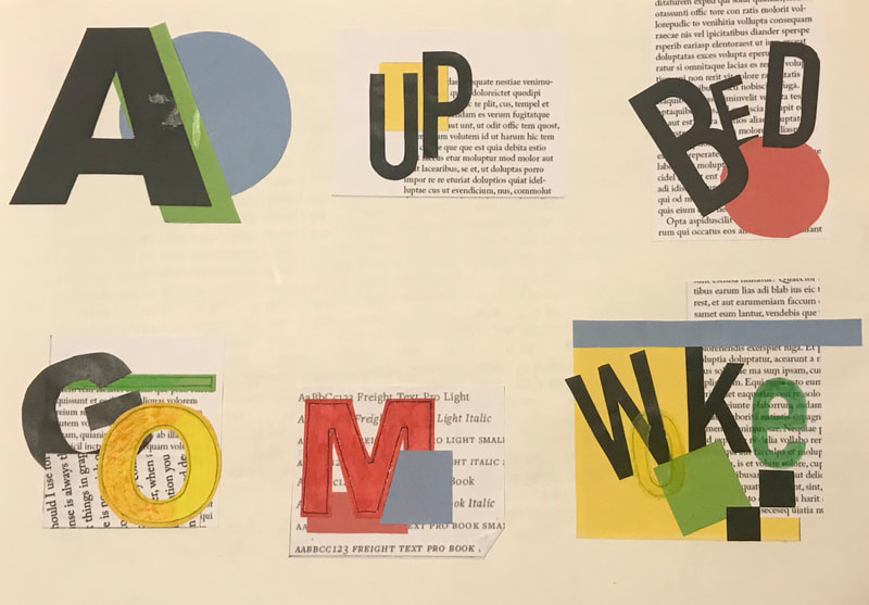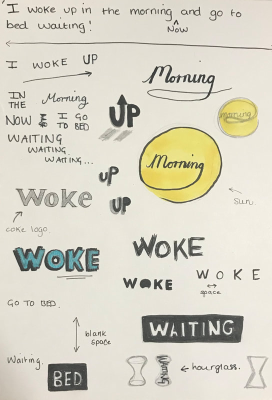 There are different features that make up letters. For this workshop we were tasked to render a sentence accurately on tracing paper, making sure to consider the anatomy of each character, 'thicks and thins', and the leading and kerning of each character/word. The Brief For our first two week project we worked as a team to create a book of experimental typography consisting of lines of text we were each given to work with to create our own individual pages. The final book is to be commercially printed and sold at the Lakes International Comic Arts Festival. A comic is most commonly described as being made up of a series of panels containing images used to express ideas. These are usually combined with text or other visual information (research from here). As graphic designers, our aim was to use type and typography to interpret and create an abstract response to the text we were given. The compositions had to be entirely typographic and created using analogue techniques and in addition to this, we were restricted to using only black and one other colour of our choosing. The aim of this project was experimentation and exploration, rather than design problem solving. Research To start me off on the right track I began with researching experimental typography to gain some inspiration. Experimental typography can include altering and manipulating the shapes of letters, playing with letter spacing (white/black space), font size, texture, and layout to create new unique designs (research from here and here). One of the graphic designers I looked into was the Swiss typography work of Wolfgang Weingart, who is known for breaking the rules of typesetting. I was particularly interested in his technique of distorting type by spacing out letters, curving lines, collaging and reorganising type to create new compositions. Furthermore, another designer I liked was Chris Ashworth, who similarly to Weingart, was inspired by Swiss design, known for using barcodes, horizontal lines and multiple transparent layers (research from here) Experimentation In order to get us started with experimenting ourselves, a workshop was held from which we were encouraged to explore different techniques and approaches. These involved taking typefaces of various sizes and styles; slicing letterforms into multiple parallel strips and sliding them against each other, mashing up two contrasting typefaces, interweaving two differing typefaces of the same letterform. Other techniques included cutting out a viewfinder to crop portions of letterforms and rearranging the squares, tearing to create an illusion of the letters disintegrating, and using tracing paper to overlap multiple layers of type. Below you can see these techniques in play through my own experimentation. I then continued to experiment further with different materials and mediums. In another workshop we were encouraged to create our own print block of a large letterform from a piece of polystyrene, and print with one/two colours, messing around with misalignment and overprint effects, using acrylic paint, crayon and coloured pens. In addition to this, I chose to distress some of the prints I made; blowing ink to create a dripping effect, sponging paint onto the stencil, overlaying wax crayon with ink and smudging charcoal. I then went on to experiment with collage techniques, trying to think about positive and negative space and the differing scales of the shapes. Development After all that experimentation it was time to start combining it with the line I was given for the comic to make my page. My line was: ‘I woke up in the morning now I go to bed waiting’. To begin, I decided to use one of the techniques by printing out two pages of the line repeated in differing fonts and sizes and interweaving them to create an abstract effect.I then decided to distress it further using an effect on Procreate to fade certain areas to make it look more worn away. I then decided to have a play on Procreate, using some of the collage techniques I learnt previously through the workshops to distort the text. I tried to think about the use of black and white space, adding small pops of colour to add more interest. The only thing I don’t like about these quick compositions is I felt it looked a little too busy, and because I did it digitally I wasn’t happy with the lack of texture that you would get if it was purely analogue. After this, I then went on to think more about the layout of the pages; how I wanted the lines to be lined up on the page and which words I wanted to put particular interest on. One idea involved setting up the page so the line ‘I woke up’ started off small and gradually got bigger to put emphasise on ‘up’. However, I decided against this as I thought that word wasn’t as important as some of the others. Another idea involved abstracting the word ‘waiting’ to look like an hourglass. In addition, I tried to think about way I could manipulate the text to create images representing the words, for example, taking away part of the ‘O’ in ‘woke’ to look like an eye and ‘morning’ to make it look like a rising sun. I also thought about how I could represent the meaning of the words through different typefaces, for example, thin, clean, spaced out letters for ‘woke’. Next I decided to play around a little more in Procreate to create a pleasing composition using some of my ideas. I was happy with the outcome but for further development I attempted to create an analogue version using the techniques from experimenting. I made stencils of some of the words and used a sponge to print the letters on the page, creating a more old-fashioned printed texture, and took the interwoven piece I did previously, adding rips and making it look faded into the background. However, I struggled with not making it look too overworked and as a result chose to go with a different approach. Here I experimented with different layouts: the first containing horiz