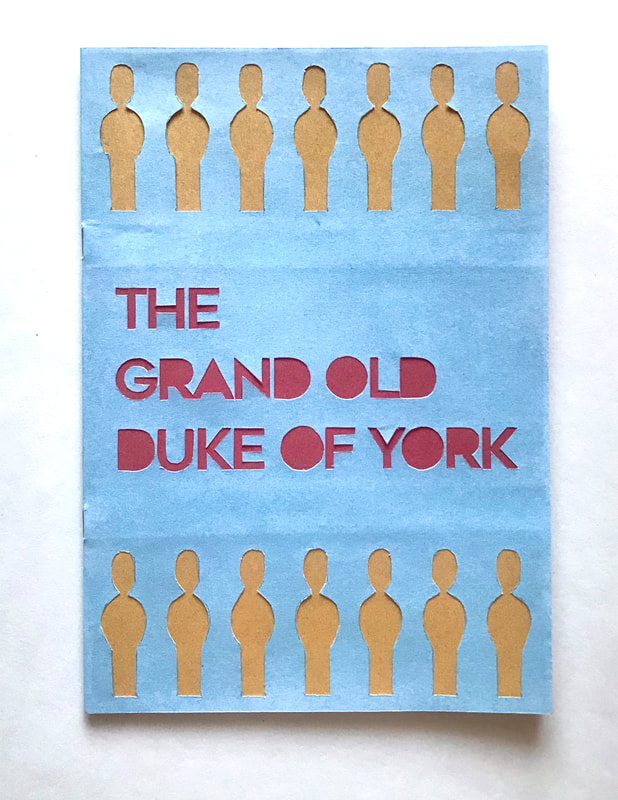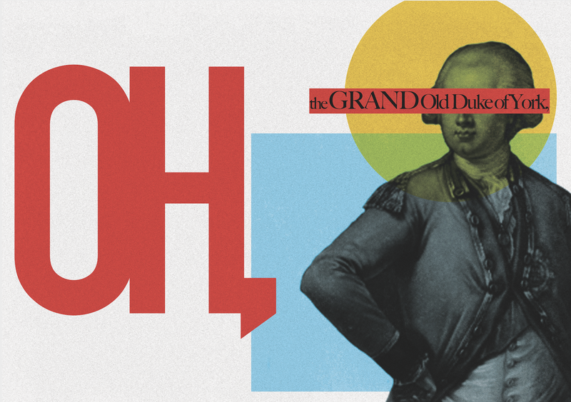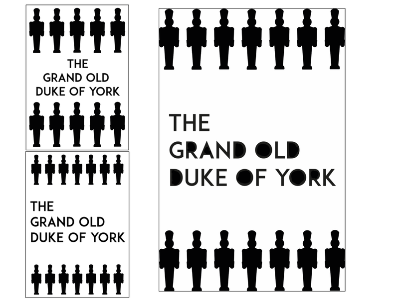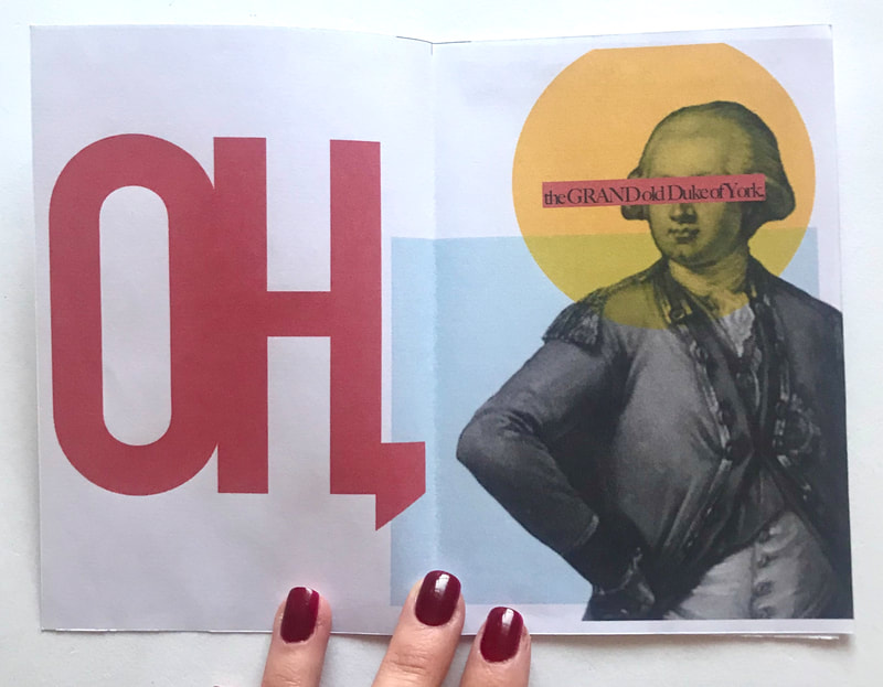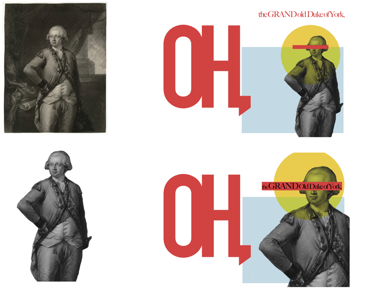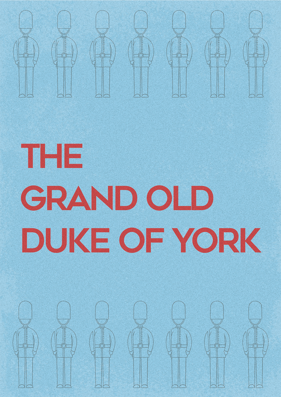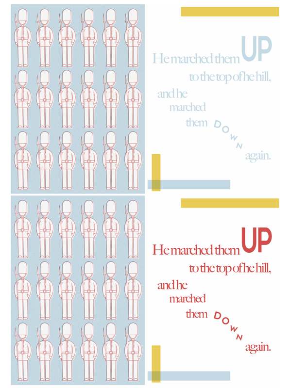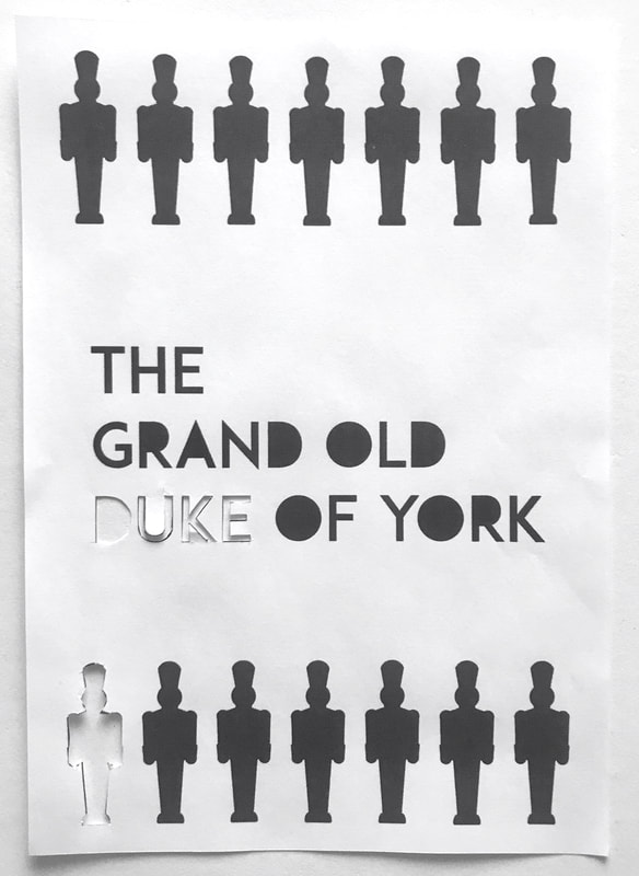 Brief For this brief, we were asked to create a 12-page bound book as a personal response to a nursery rhyme. I chose 'The Grand Old Duke of York'. The design did not have to be aimed at children and we had complete freedom with size, format and technique. Research I began by researching the rhyme online, trying to find any hidden or underlying meanings behind the storyline. I found that one theory behind the rhymes origins was that it is a reference to Prince Frederick, Duke of York and Albany during the French Revolutionary Wars, the 'hill' being the town of Cassel. The rest of my research revolved around looking up techniques for in Photoshop. I found a good set of tips from this website here, which I used to help me create a few of the effects in my book. I then began drawing up a couple of thumbnail ideas, thinking about if I wanted to include any variations of spreads, or cutting shapes into the pages. Mock Ups After my thumbnails I created a few quick mock ups in order to explore how I wanted it to be structured and which lines of the rhyme where going to be on each page. I decided due to the rhyme being short and because I needed it to fill up 12 pages, that there would be mostly double page spreads. I also experimented a little bit with cutting out the letters on the front cover to add more variation and interest. Development I began developing my ideas on Photoshop, trying out different layouts and ways to use type to represent the lines of the rhymes. I knew I wanted to focus more on using typography then actually illustrating the rhyme, but I still wanted to add some imagery so for the first line I chose to include a photo of the Duke of York (linked here). In addition, being inspired by some of the work I did for the activities the previous week, I wanted to incorporate simple shapes and colours throughout the pages. For the second line I played around with different ways to represent a 'thousand men' using type. For the third line I created a pattern for one of the pages taking this vector image of a soldier. I then created a rise print effect and played around with the colours to make it coherent with the other pages. I also played around with overlong a vector of the York Minister (here) onto one of the pages but later decided against it as I preferred the page without. Final Piece