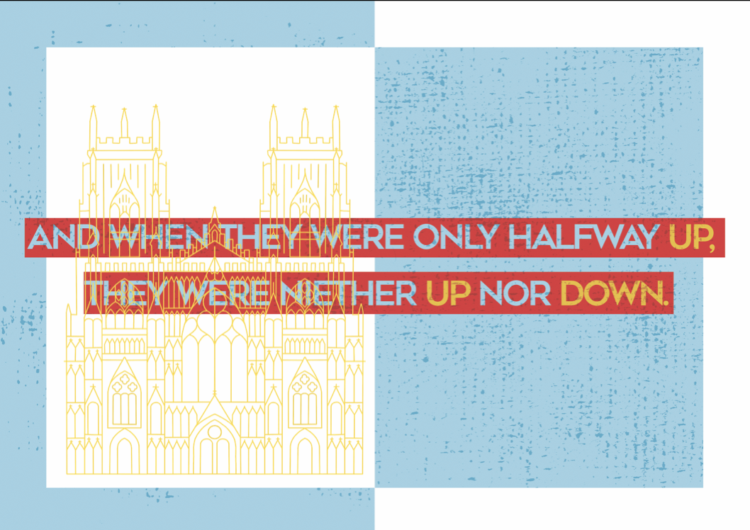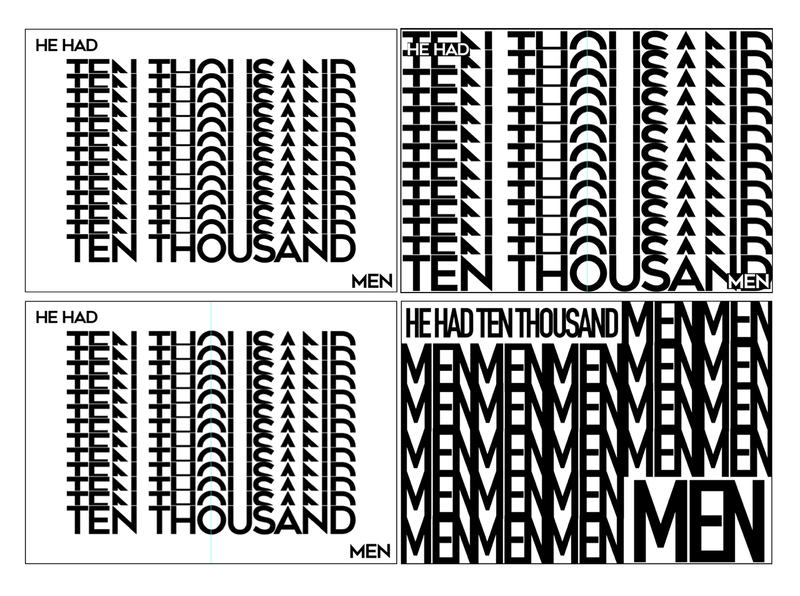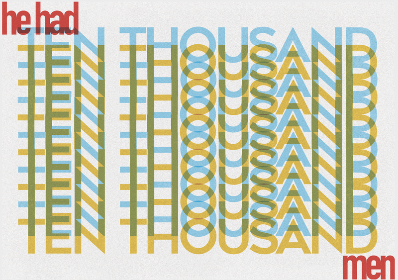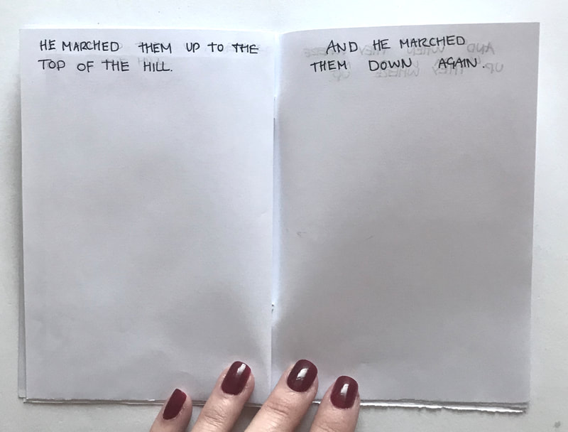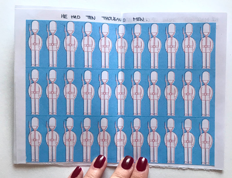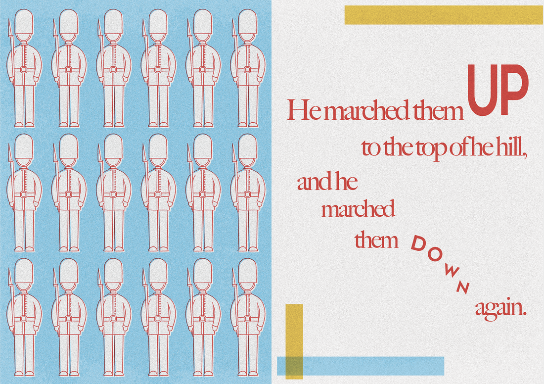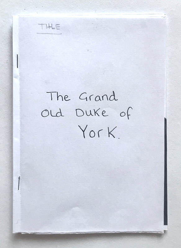 Brief For this brief, we were asked to create a 12-page bound book as a personal response to a nursery rhyme. I chose 'The Grand Old Duke of York'. The design did not have to be aimed at children and we had complete freedom with size, format and technique. Research I began by researching the rhyme online, trying to find any hidden or underlying meanings behind the storyline. I found that one theory behind the rhymes origins was that it is a reference to Prince Frederick, Duke of York and Albany during the French Revolutionary Wars, the 'hill' being the town of Cassel. The rest of my research revolved around looking up techniques for in Photoshop. I found a good set of tips from this website here, which I used to help me create a few of the effects in my book. I then began drawing up a couple of thumbnail ideas, thinking about if I wanted to include any variations of spreads, or cutting shapes into the pages. Mock Ups After my thumbnails I created a few quick mock ups in order to explore how I wanted it to be structured and which lines of the rhyme where going to be on each page. I decided due to the rhyme being short and because I needed it to fill up 12 pages, that there would be mostly double page spreads. I also experimented a little bit with cutting out the letters on the front cover to add more variation and interest. Development I began developing my ideas on Photoshop, trying out different layouts and ways to use type to represent the lines of the rhymes. I knew I wanted to focus more on using typography then actually illustrating the rhyme, but I still wanted to add some imagery so for the first line I chose to include a photo of the Duke of York (linked here). In addition, being inspired by some of the work I did for the activities the previous week, I wanted to incorporate simple shapes and colours throughout the pages. For the second line I played around with different ways to represent a 'thousand men' using type. For the third line I created a pattern for one of the pages taking this vector image of a soldier. I then created a rise print effect and played around with the colours to make it coherent with the other pages. I also played around with overlong a vector of the York Minister (here) onto one of the pages but later decided against it as I preferred the page without. Final Piece