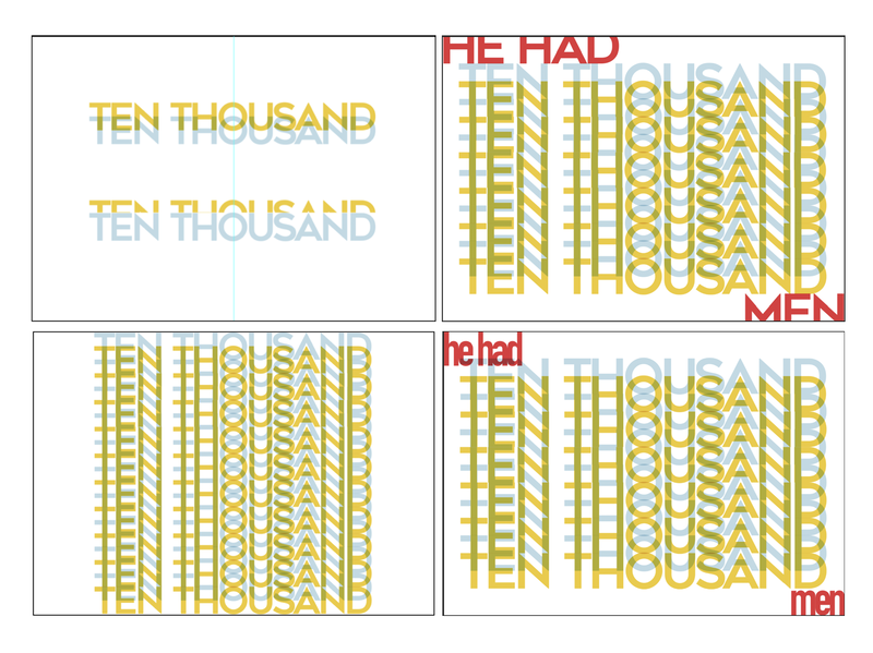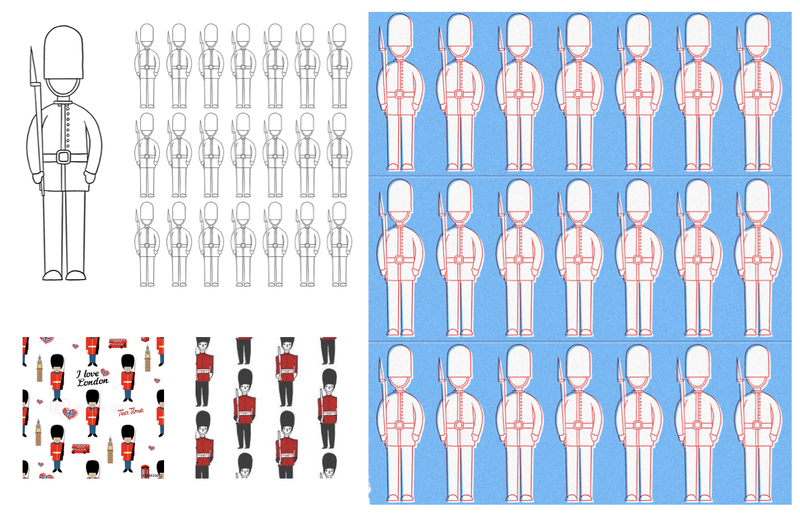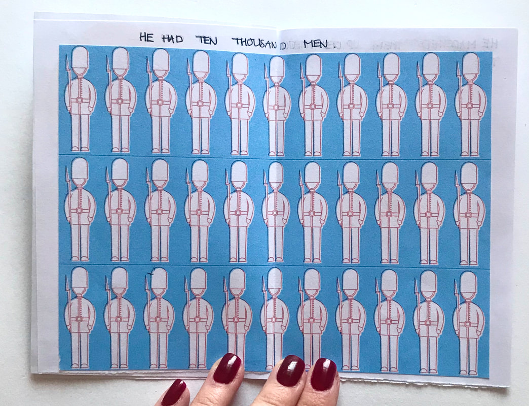 When I had done layout out my pages, I wanted to add some texture using noise and overlaying textures I downloaded here, in order to give it a more printed effect. For the cover I cut out the soldier silhouettes using a craft knife and stuck onto the underlying colours, and for the back I kept it simple and just added a little logo I made. I then uploaded the pages into Adobe InDesign, and printed and bound the book together using a simple saddle-stitch (stapled). I'm happy with the outcome of the project considering my lack of expertise with the programs I used. I did find it quite difficult to find different ways to change the type as the same words were repeated often in the rhyme but I think the pages work well together as a complete book nonetheless.