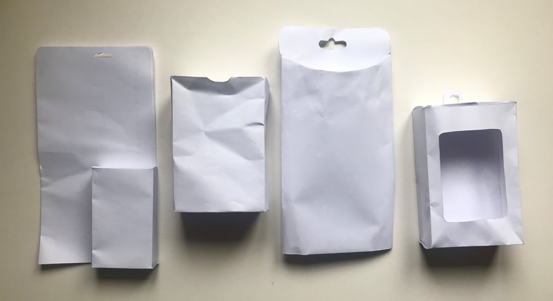 After I had finished designing the surface graphics it was time to combine them with the 3D pack itself. I used spray mount to stick the labels onto the nets. Below you can see the unfolded net of my packaging solution as well as images of the 3D folded dummy version at various angles and containing the product. |