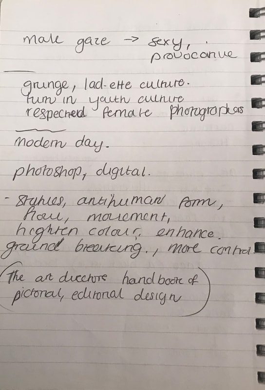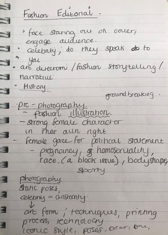 Fashion editorial storytelling refers to visual photographic stories used commercially and is considered to be a creative way of revealing the attitudes and tastes of the time, as well as woman self image. However, there are doubts as to whether it is to be considered a serious form of art or that it lacks in artistic integrity. After scanning through a few fashion publications, I chose to critique some fashion stories from the December 2019 issue of 'Elle' magazine. The first was called 'The Late Show' and illustrates the best dresses and coats for an audience interested in fashion for the party season. It depicts the models glamorously, using photographic imagery with playful poses, various candid shots and dark filters that make them look as if they were actually taken at a party. The typography is interesting as it contains a gentle mixture of serif fonts in addition to added curves and italics onto some of the letters. I think this could be said to represent the strength of the female but also the soft femininity of some of the elements of clothing advertised. Composition of the pages is kept slightly varied to give more interest, having some pages as single framed images and others more collage like to show a sequence of emotions and the movements of the models. Colours are also kept constant in every photo; outfits are complimented by the colours of the setting they are in. The entire piece just screams the vibe of having a good time. The second fashion story I wanted to critique is called 'Rise and Shine'; a fashion story featuring bold and colourful pieces for those who want to be noticed. The model is seen wearing a variety of interesting pieces; the photographic compositions are set in the streets to highlight the idea of standing out from the crowd. In addition the backgrounds are given slight pops of colour in contrast to the darker looking clothing, giving the images more interest. Poses are also mixed up, ranging from purposeful, typical type poses to more candid ones of the model walking through the street to give it a more real life feel, using natural light to capture the reflections of some of the shiny pieces. The typography is kept relatively simple, using a clean bold sans serif type face, leaving the real eye-catching parts to the photographic images themselves. Layout of images is also kept simple with constant use of covering the whole page and some double page spreads. Class Notes: