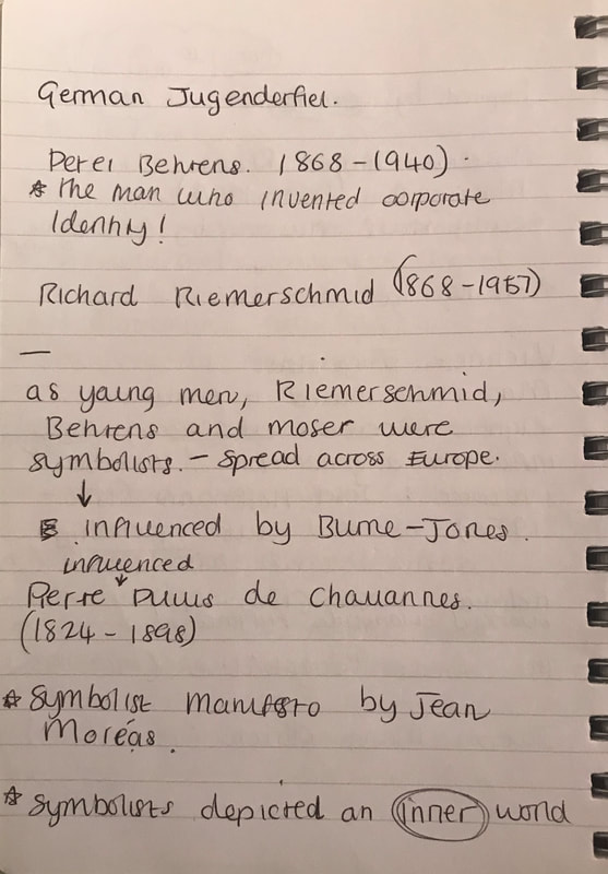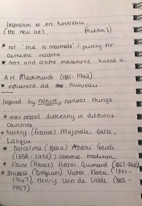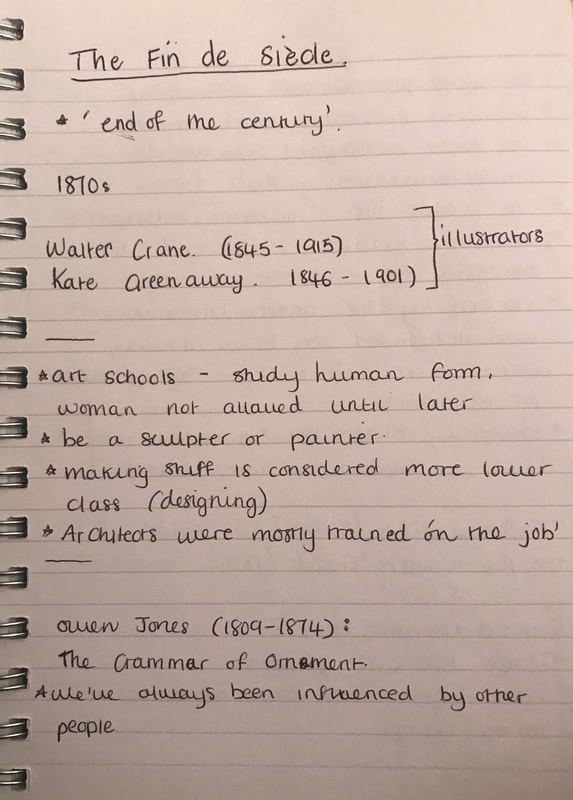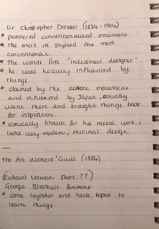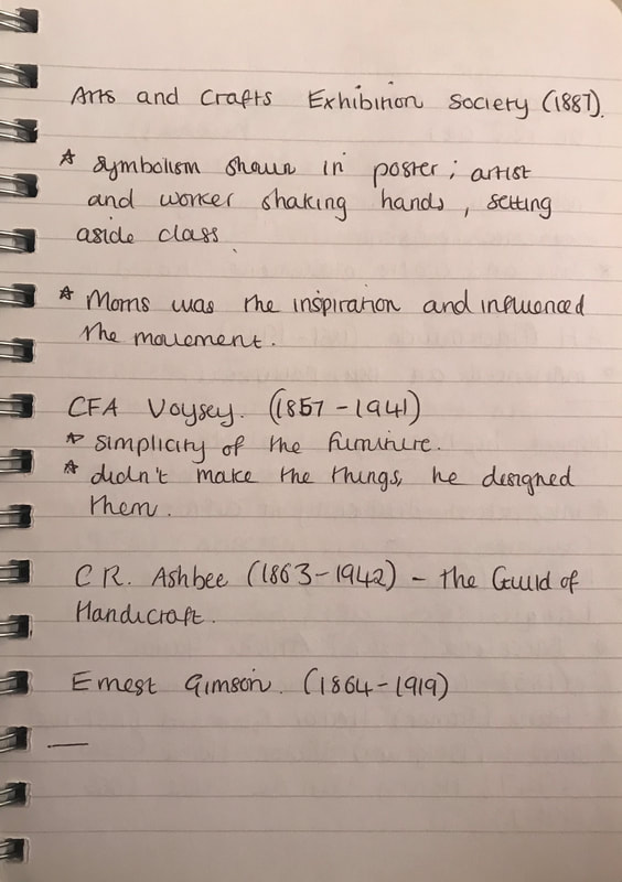 ![]() The Late 19th Century During the late 19th century, if you wanted to become a painter or sculptor (and you could afford it), you could go to art school. You would spend most of your time studying the human form as making and designing things was considered to be more lower class. It was rare you would see a female as women were not allowed to attend art schools until much later on; they weren’t even allowed to paint the naked body and would be limited to studying sculptures instead. If you wanted to become an architect, you would learn it on the job much like an apprenticeship. Outside of this, there were those who also became interested in design alongside their main career. For example, Owen Jones was an architect considered to be one of the most influential design theorists of his time. He released the book ‘The Grammar of Ornament’, a design sourcebook containing ornamental designs from all over the world in order to help other aspiring designers take influence from others. Another inspiring artist was Dr. Christopher Dresser, a designer and design theorist who considered himself to be an ‘ornamentist’. He pioneered conventionalised ornament. The more something is stylised the more it is conventionalised. He is widely known to be the worlds first ‘industrial designer’; he understood how things were made but he would provide the designs to ceramic and furniture companies rather than making the himself. It is clear that he was claimed by the Aesthetic Movement, influenced by Japan after a trip to the country where he brought back things for inspiration, as well as being iconically known for his modern/minimal looking metal work ![]() The Arts and Crafts Movement The Arts and Crafts Movement was an international trend in the decorative and fine arts marking the beginning of a shift in how it was thought things should be made. This was due to the damage the effect of industrialisation had on society. In 1884 a group of British architects created an organisation focused on the ideas of William Morris and the Arts and Crafts Movement in order to bring artists/designers together to discuss topics and learn things from each other. Later on, the Art Workers Guild formed the Arts and Crafts Exhibition Society in order to exhibit the decorative arts alongside the fine arts. It is interesting to note that the poster for this society contained an illustration of an artist and worker shaking hands, a symbol for setting aside class to come together as creatives. An example of a designer considered to use the Arts and Crafts style is C. F. A. Voysey, an English architect, furniture and textile designer, mainly known for building several country houses but who also designed wallpapers, fabrics and simple furnishings in his early career. Another well known contributor to the movement was C. R. Ashbee, a British architect and designer who founded the Guild of Handicraft to help teach traditional craft making skills. Art Nouveau The members of the Arts and Crafts movement were not particularly big fans of Art Nouveau because they believed it was not true to materials, taking hours to carve, having elements not necessary for the structure and designed purely for aesthetic reasons. However, it did originate in the UK. A big influence of Art Nouveau was nature and natural things. Artists were inspired by plant forms which they then flattened to create abstract and elegant creations. The style was interpreted differently by different countries; the French city of Nancy embraced it throughout the entire region covering buildings with extravagant floral and leaf motifs. Artists including Émile Gallé and Louis Majorelle co-founded the ‘Ecole de Nancy’, the leaders whose inspiration stemmed from plants and animals. The style was also interpreted different by designers in Madrid. The Colonia de la Prensa is a good example of architecture with beautiful modernist ceramics, wrought gates and statues. ![]() It is clear there is not just one style of Art Nouveau; another influence was geometry, and asymmetrical compositions, thought to be pioneered by the Scottish architect Charles Rennie Mackintosh. His style was recognised through his use of black and white geometric patterns, characterised by strong but graceful abstract lines and shapes. He is largely know for designing the building that houses the Glasgow School of Art, one of the cities leading landmarks. The Viennese loved Mackintosh and invited him to exhibit at the eighth Secession exhibition, founded by artists such as Gustav Klimt and Josef Hoffman, who Mackintosh influenced significantly alongside a generation of other Viennese designers. Viennese Jugendstil, was hugely shaped by the architect Otto Wagner, whose buildings were usually symmetrically arranged, normally with floral ornamental exteriors using marble, glass, tiles and metal. Another designer involved largely in founding the Secession was the graphic designer Koloman Moser, who alongside Josef Hoffman established the Wiener Werkstätte, a company that brought together designers and artists from different specialities. Some good examples of the geometric style of Art Nouveau are shown in Hoffman's designs such as the 'Kubus Armchair’ with the use of squares and cubes, and graphic art with clean linear lines. The Symbolists As a young man, Moser was one of the many artists considered to be ‘Symbolists’, a movement that sought to use art to escape from reality and represent ideas and emotions, depicting an inner world. It was heavily influenced by the work of Edward Burne-Jones. A good example of a symbolist painting is 'The Crying Spider’ by Odilon Redon; a representation of his internal feelings and ghosts of his own mind through the image of a crying human face on a spiders body. Another good example is 'Anxiety’ by Edvard Munch, symbolising emotions of heartbreak and sorrow. Class Notes: Bibliography: